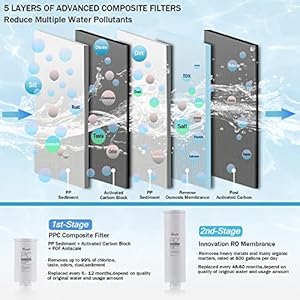 [Advanced composite filters]:The composite integrated filters result in more effective filtration, double cartridge 5 filter stage ,effectively removed sediment,rust, large particles, colloids, chlorine, fluoride, scale, etc. A Large Reverse osmosis, reduces most contaminants, such as TDS and heavy metals.Using reverse osmosis filtration technology with a filtration accuracy of 0. 0001μm, 5 years service life of RO cartridge,approximately 18000 L of purified water in 5 years.