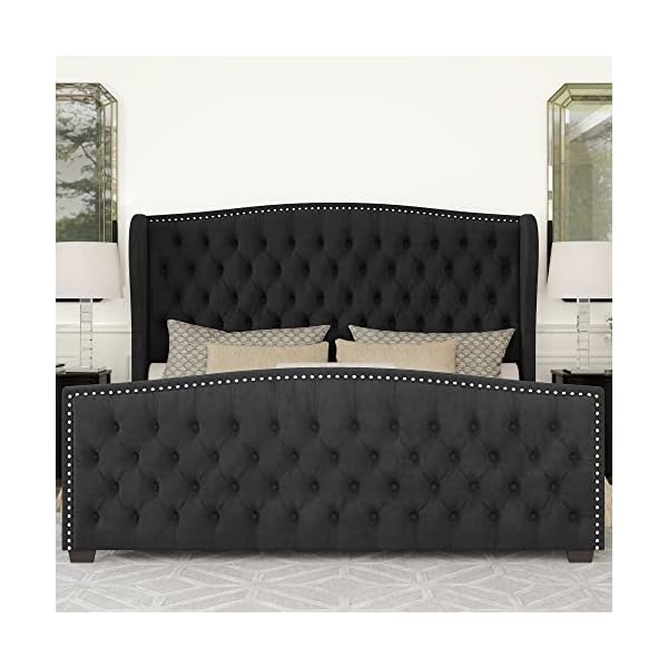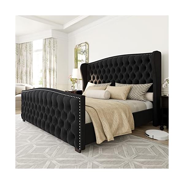 AMERLIFE Queen Size Platform Bed Frame, Velvet Upholstered Bed with Deep Button Tufted & Nailhead Trim Wingback Headboard/No Box Spring Needed/Black