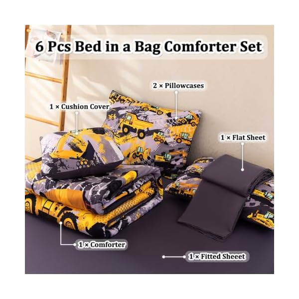ASKOTU Truck Twin Bedding Set for Boys, 6 Pcs Kids Construction Truck Comforter Sets with Sheets, Construction Excavator Twin Boys Bedding Sets