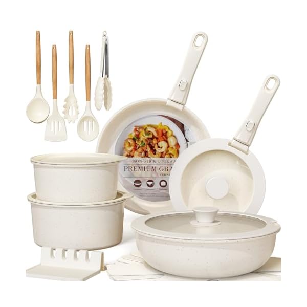 Astercook 21 Pcs Pots and Pans Set Non Stick, Ceramic Cookware Set Detachable Handle, RV Kitchen Cooking Set Removable Handles, Oven Safe, Induction Ready, Stackable Non-stick Set, Cream White