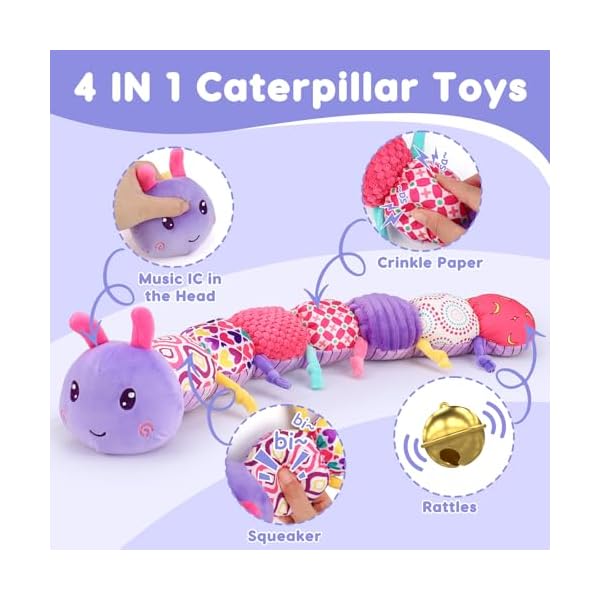 【4-in-1 Caterpillar Toys】Our infant toys can be used as animal plush toys, musical toys, rattle toys, and crinkle toys. This baby musical toy has bright colors, various fabrics, patterns and textures, greatly stimulate baby’s brain development. Multiple ways to play make it a great newborn toys 0 3 months brain development. Perfect baby toys 0-6 6-12 months development.