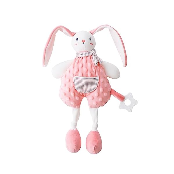 Multipurpose:Snuggle toy with soft teether Helps relieve discomfort when baby’s gums are teething, 3D plush fabric increases baby’s tactile perception, which will provide endless snuggles and save many parents from sleepless nights or stressful outings.