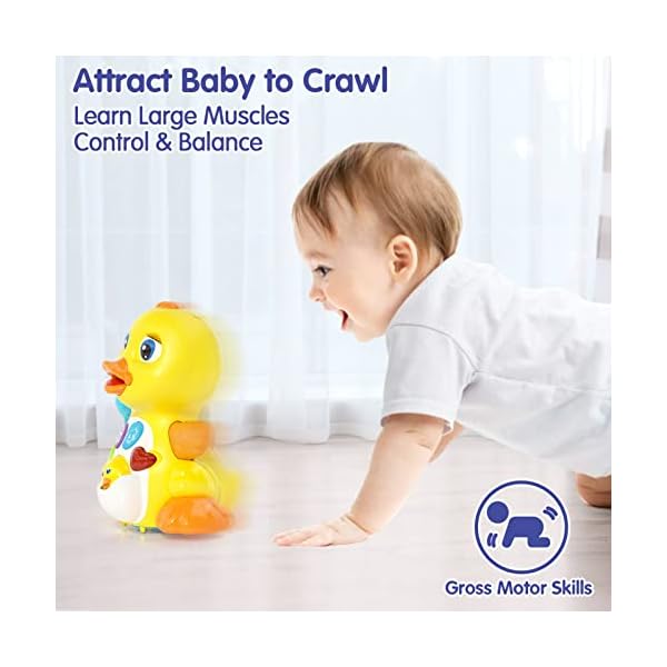【Attract Baby to Crawl & Build Large Muscles】When pressing the button on the head of the baby toys, it will dance and move with happy baby tunes music & lights. The baby crawling toys are very attractive which will encourage your baby to crawl & chase. Your little one can develop gross motor skills and learn how to control large muscles, which enable crawling, walking, running, jumping & body balance during playtime. Perfect choice as baby toys 6 to 12 months infant toys 6 to 12 months.