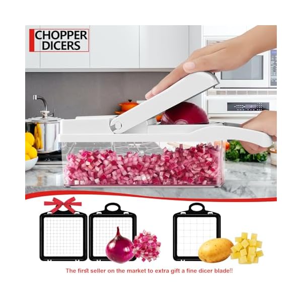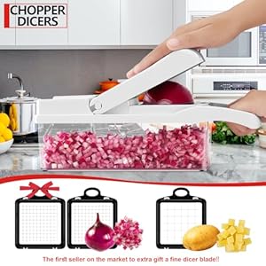 ✔️【2023 Upgraded Durable and Safe Materials】-Most food chopper on the market are made of 420 stainless steel. In comparison, our mandoline dicer’s blades is made of rust-resistant heavy-duty 420J2 stainless steel combined with punching blade manufacturing technology. It is stronger and sharper than ordinary 420 stainless steel. The body is made of ABS plastic, non-toxic and BPA-free, making it a perfect tool for cooking easier, faster, and ensuring your family’s guarantee healthy meals.