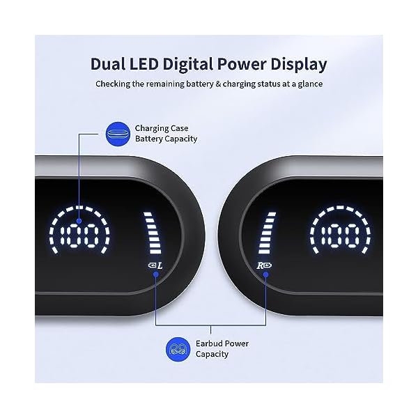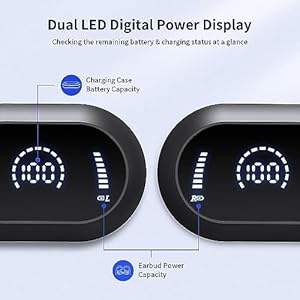 【50 Hours Playtime & Outer Dual LED Display】 Wireless Earbuds’ Playtime lasts for over 10 hours from single charge and total 50 hours with charging case. Dual digital LED power display outside of the case is to show the power level for charging case and bluetooth headphones. When charging for the case, the LED light will start to flash from 1 to 100.Don’t have to worry about any power issue.