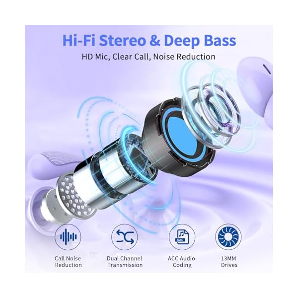 Hi-Fi Sound Quality and Crystal-clear Call: The noise canceling earbuds wireless incorporate 14.2mm double-layer diaphragm drivers, delivering sound with strong bass, clear mids, and bright treble. Benefit from Bluetooth 5.3, the wireless headphones bluetooth establishes a consistent connection to your device within a 30ft range. Besides, the built-in microphones let your voice be transmitted with clarity and precision. Experience hassle free conversations, free from ambient distractions.