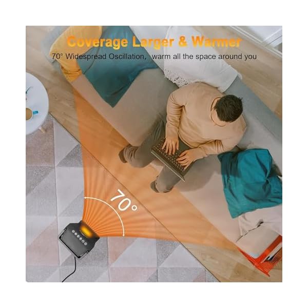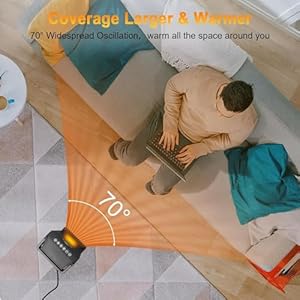 đ„ă70°Oscillation and Tip-Over Shutdown ProtectionăThis indoor space heater can be rotated around 70 degrees, so it can heat the entire room quickly and evenly, while maintaining a consistent temperature, allowing multiple people to feel the warmth.When your child or pet accidentally knocks over the heater, the heater will automatically turn on shutdown protectionïŒsafe for family with children and pets.