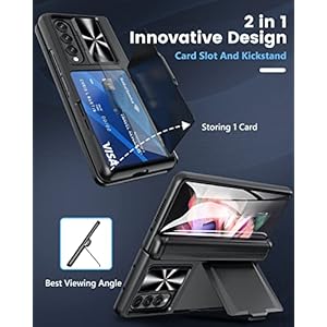 【Credit Card Storage Kickstand Design】: Our Samsung galaxy z fold 3 case has a multi-function card slot kickstand device. ☀️You can use it as a card slot, it can put your bus card, bank card, ID card and so on. This galaxy z fold 3 wallet phone case that can hold 1 to 2 cards depending on the thickness of the cards. ☀️Can use the door on it as a stand if you didn’t want to use it as a cardholder. Free your hands when you enjoy moives or chatting.