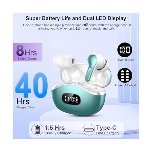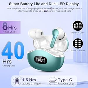 Extended 40H Playtime and LED Power Display: A single charge of the wireless earbuds bluetooth provides 8 hours of playback, the stylish and compact charging case provides an extended charge when you need it, up to 40 hours of playtime. The dual LED battery indicators on the charging case keep you informed about the status of both the in-ear headphones and the charging case. USB-C charging port ensures faster and safer charging, ensuring a day-long musical experience.