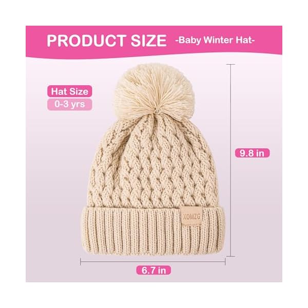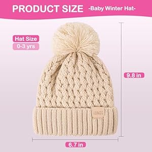 Good Elasticity:The cute hat is one size with good elasticity for kids,fits for kids ages from 0-3 years old.This beanie is highly elastic can be folded and adjusted as required,it completely covers your child’s ears and keeps them warm.No pressure on the baby’s head.